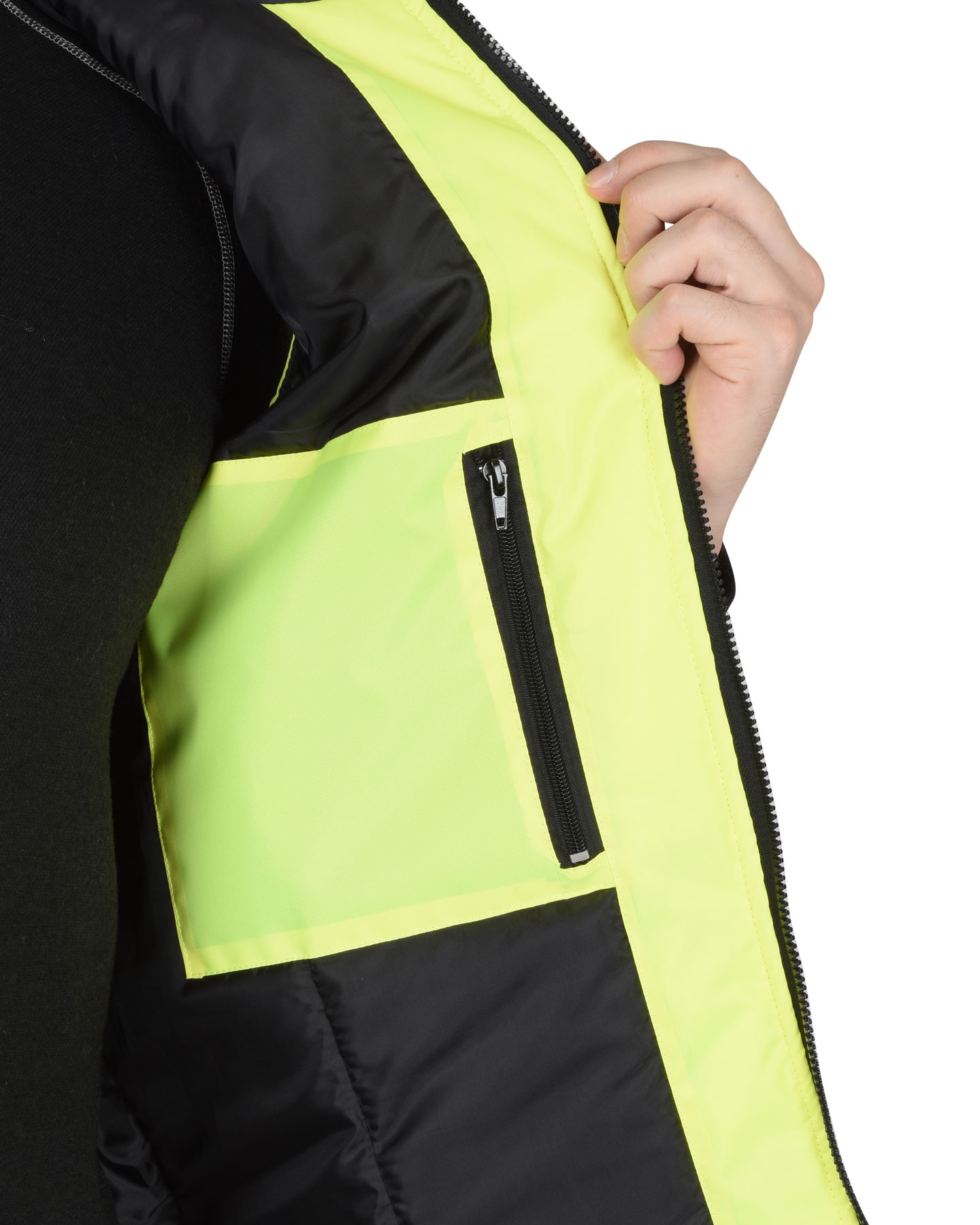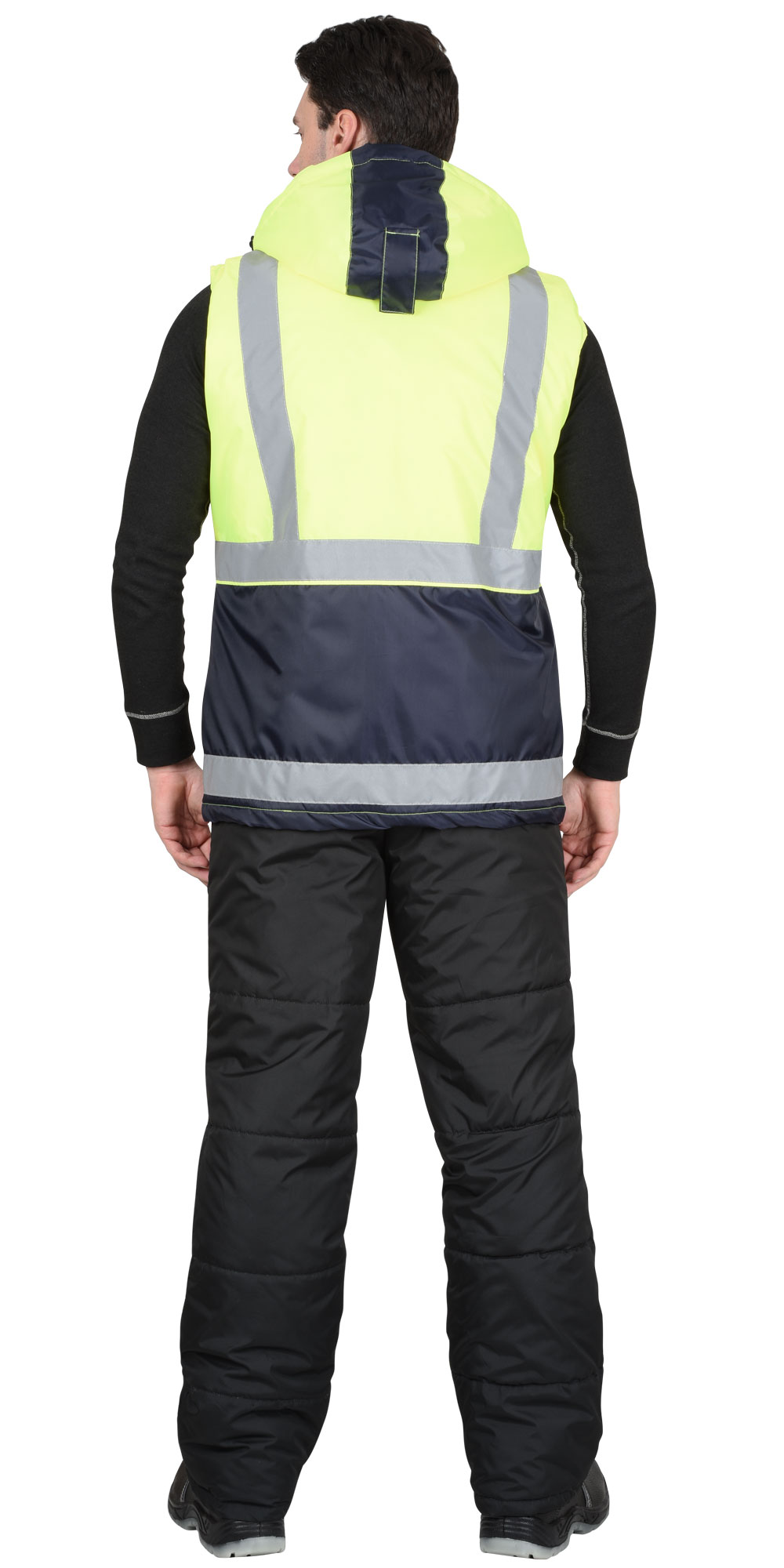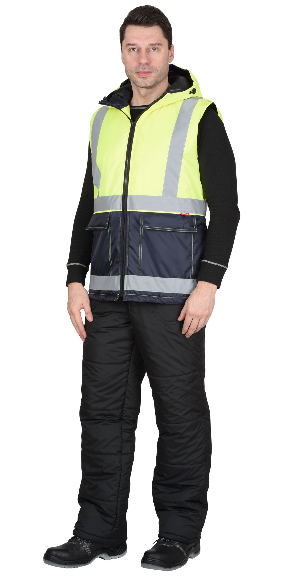 Жилет утепленный, с центральной бортовой застёжкой на тесьму - «молнию», с накладными карманами и клапанами застегивающиеся на потайную липучку 4,0см, с втачным капюшоном, с внутренним карманом застегивающийся на тесьму - «молния». В жилете предусмотрен лента светоотражающая (серая) 50мм 100% п/э для обеспечения сигнальной видимости в условиях пониженной видимости.