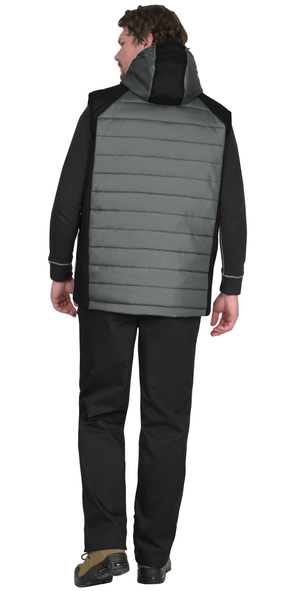 Жилет комбинированный из ткани двух цветов, с центральной застежкой на молнию, с удлиненной фигурной линией низа по спинке, с втачным капюшоном. Центральные части переда и спинки простеганы вместе с утеплителем. Жилет с левым нагрудным прорезным карманом на молнию, нижние карманы в швах. На подкладке с правой стороны накладной карман на молнию.