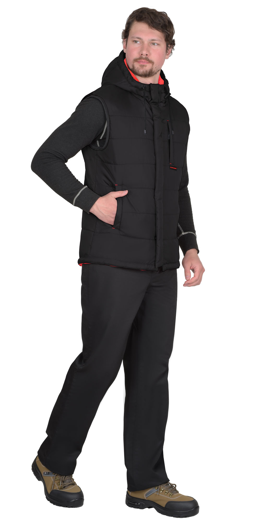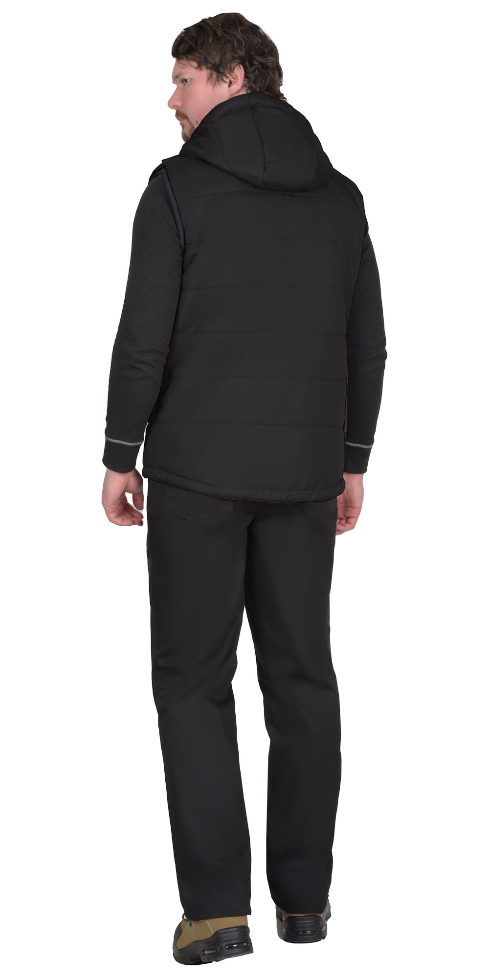 Жилет утепленный, стеганный, на подкладке, прямого силуэта, с втачным капюшоном, с центральной бортовой застежкой на тесьму - "молния", накрытую ветрозащитным клапаном, пройма окантована резинкой. Полочки с прорезными карманами, на левой полочке нагрудный прорезной карман, застегивающийся на тесьму - "молния". ГОСТ 25295-2003
