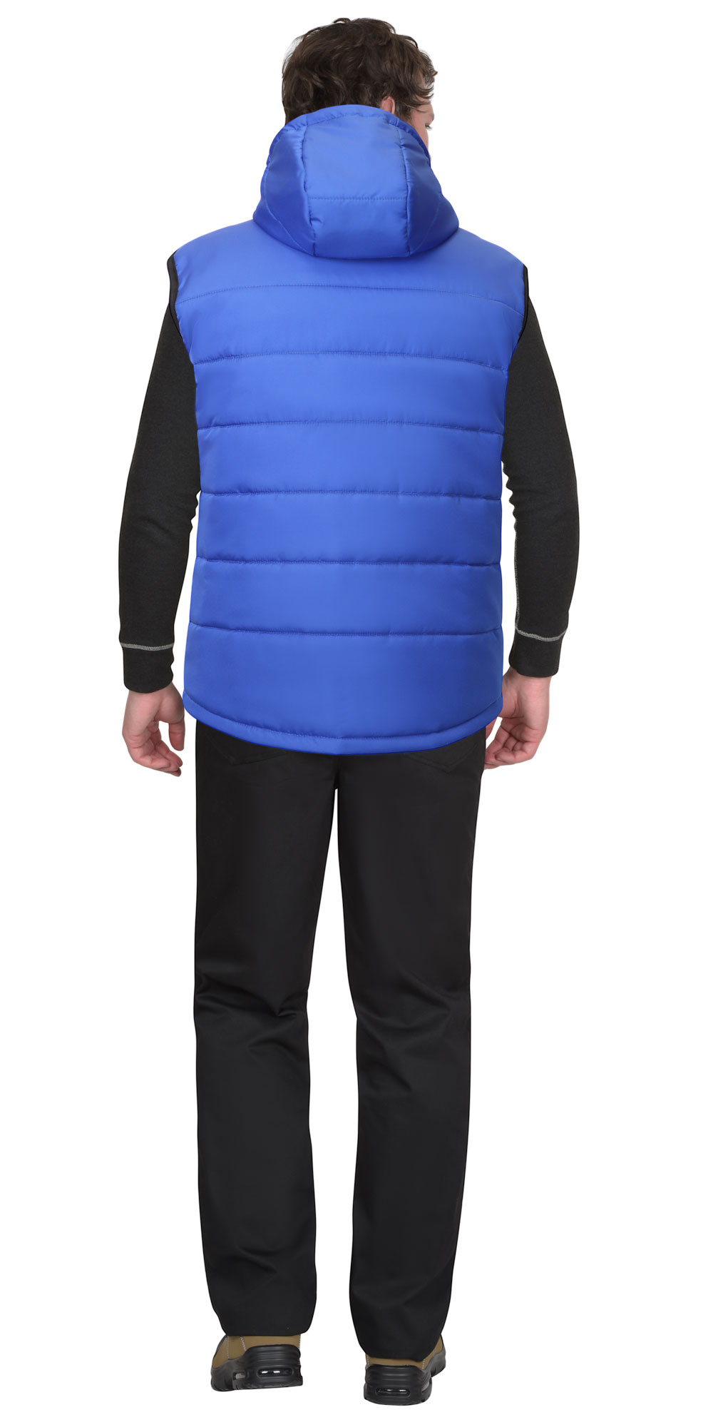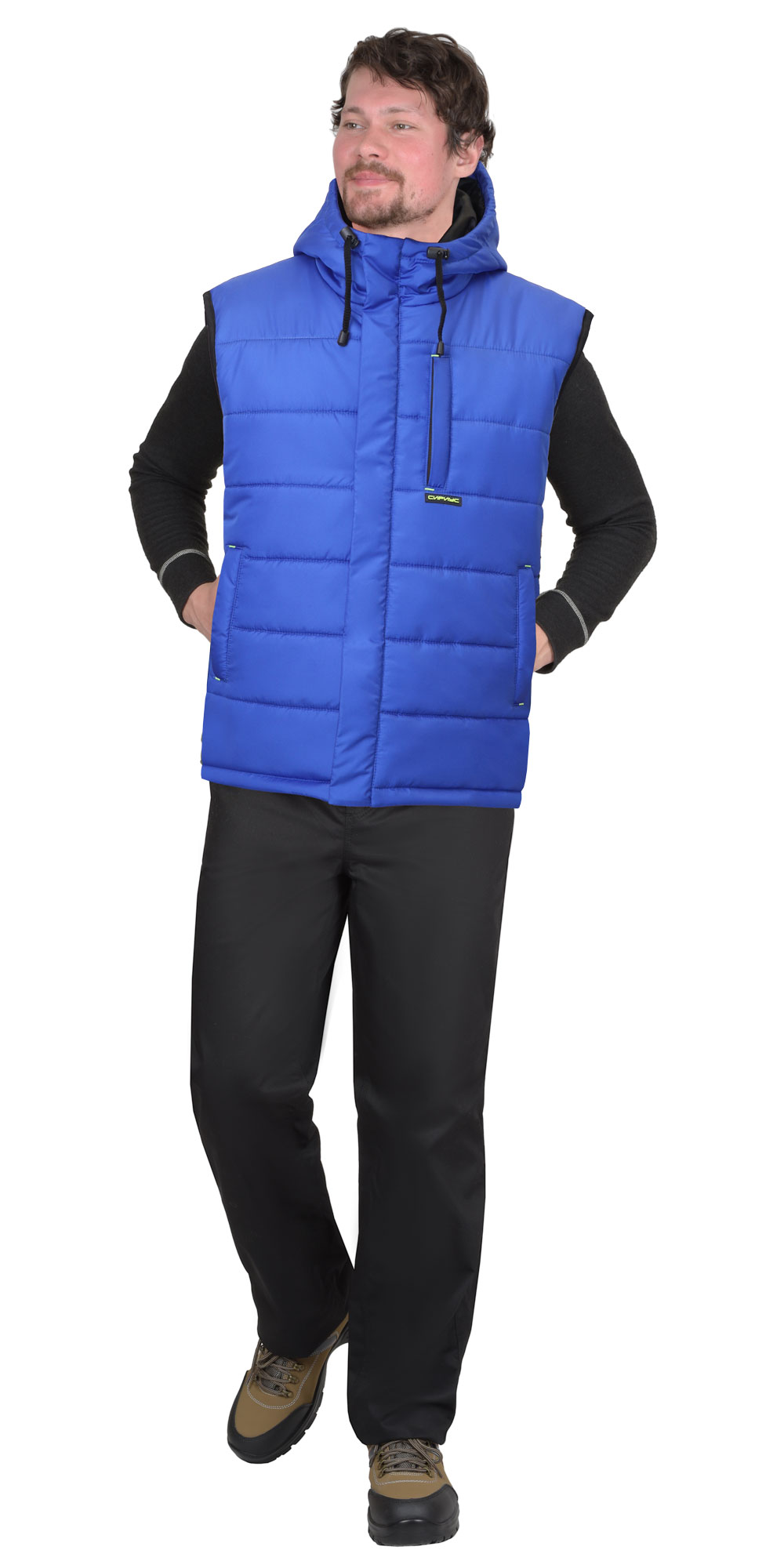Жилет утепленный, стеганный, на подкладке, прямого силуэта, с втачным капюшоном, с центральной бортовой застежкой на тесьму - "молния", накрытую ветрозащитным клапаном, пройма окантована резинкой. Полочки с прорезными карманами, на левой полочке нагрудный прорезной карман, застегивающийся на тесьму - "молния". ГОСТ 25295-2003
